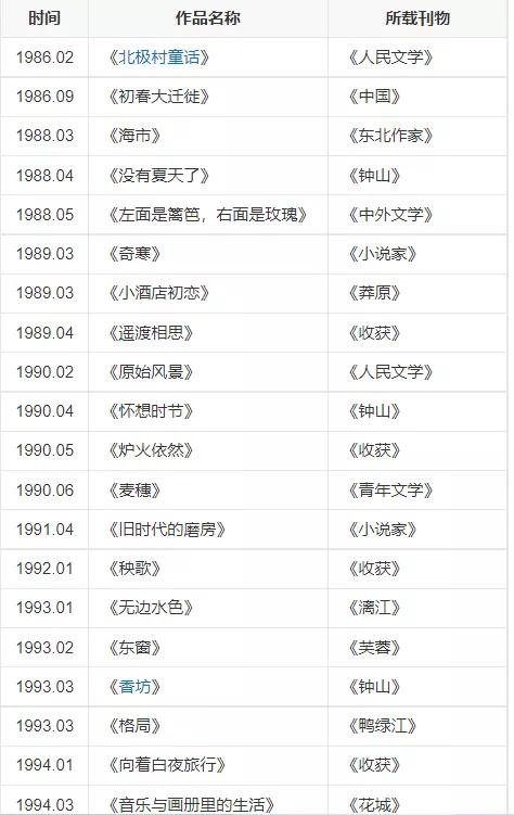 1994年,在《收获》杂志上发表了小说《向着白夜旅行》。