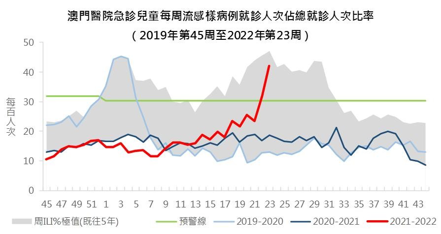 根据医院流感样疾病监测资料显示,澳门流感样病例就诊人次由5月初开始上升,尤以成人病例明显。其中第23周成人急诊因流感样病例就诊人次占总就诊人次的比例,为每百人次有13.2人次,较前一周7.9人次及前四周2.7人次分别上升66.3%和384.4%,较去年同期的1.9人次上升近586.9%;而儿科急诊的比例为每百人次有42.1人次,较前一周32.0人次及前四周21.7人次分别上升31.3%和93.4%,较去年同期的18.6人次上升近126.3%。