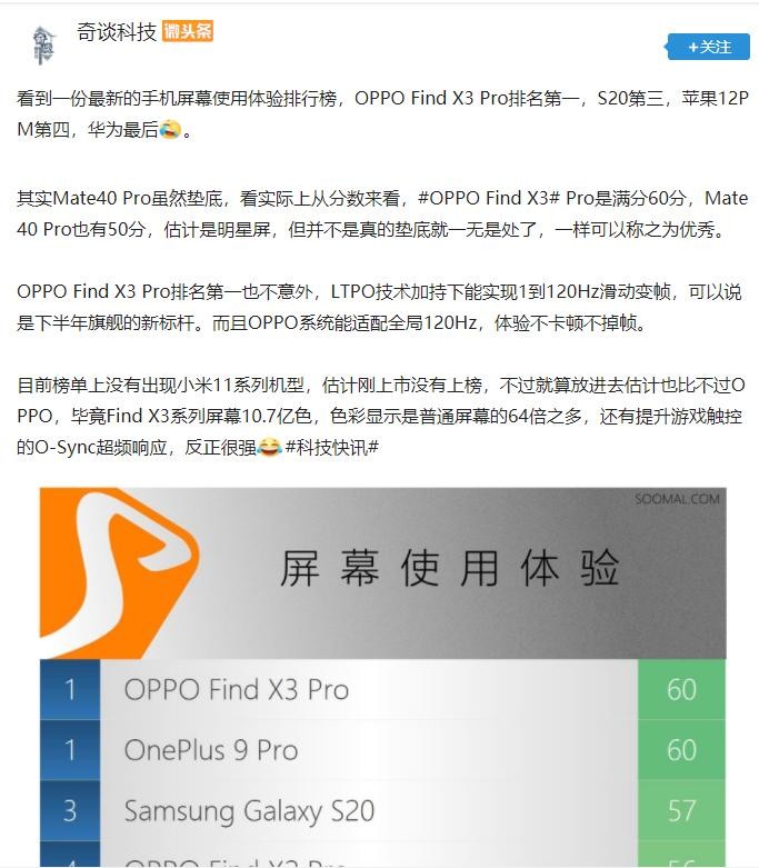 有网友在网上分享了自己看到的一份最新的手机屏幕使用体验排行榜,其结果相信会让很多人感到意外,OPPO Find X3 Pro以60分的成绩登顶第一,远超三星苹果。而三星自家的旗舰S20排名第三、苹果的iPhone12 Pro Max更是跌出前三,排到了第四名。下面我们就来分析分析OPPO Find X3 Pro的屏幕到底好在哪里。
