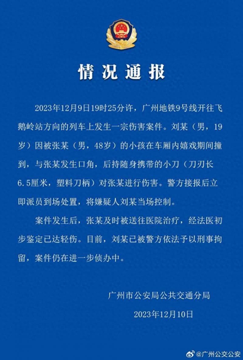 据广州市公安局公共交通分局12月10日通报,12月9日19时25分许,广州地铁9号线开往飞鹅岭站方向的列车上发生一宗伤害案件。刘某(男,19岁)因被张某(男,48岁)的小孩在车厢内嬉戏期间撞到,与张某发生口角,后持随身携带的小刀(刀刃长6.5厘米,塑料刀柄)对张某进行伤害。警方接报后立即派员到场处置,将嫌疑人刘某当场控制。