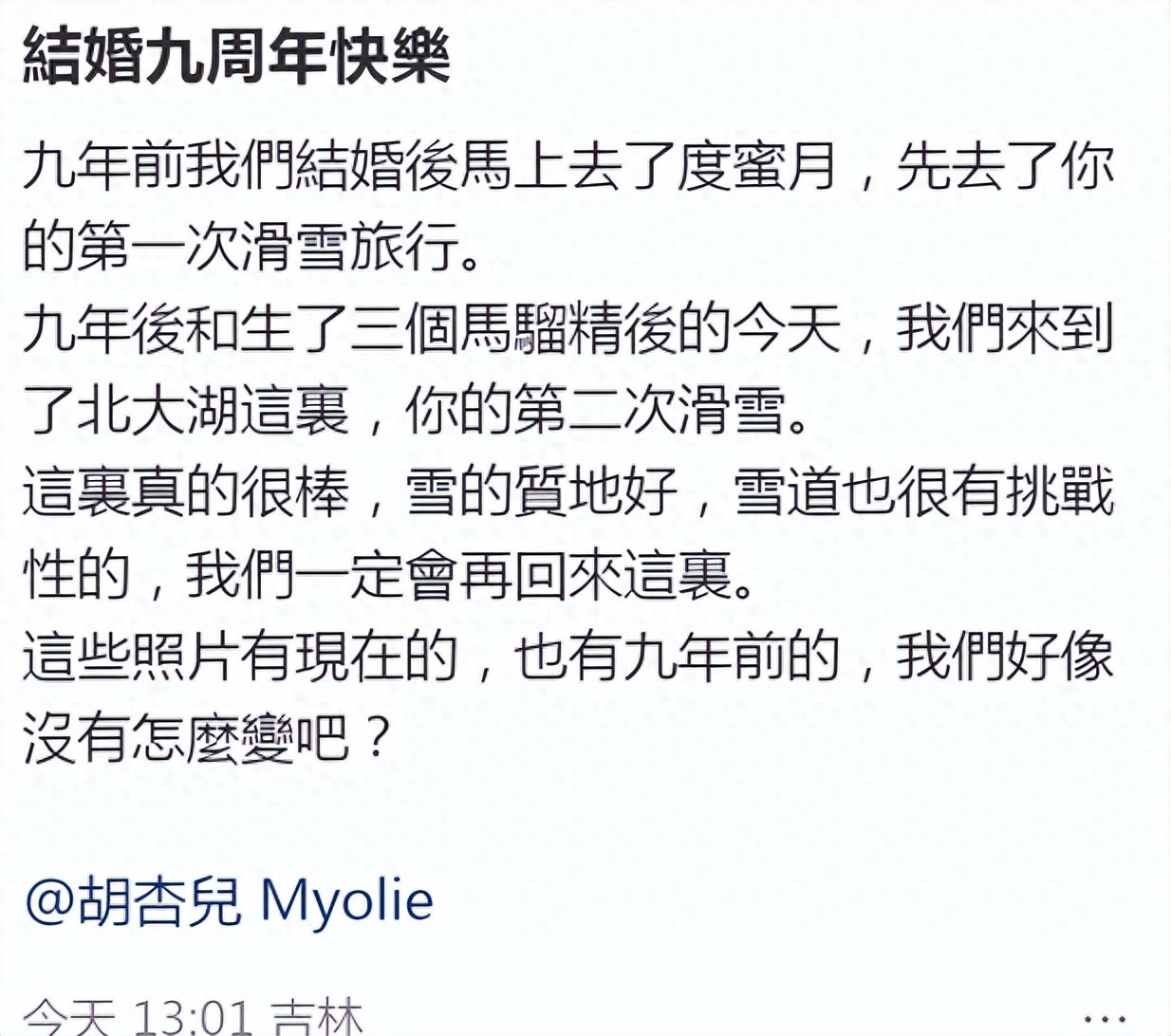 目前,和太太正带着三个儿子在东北吉林滑雪的李乘德,他透露称9年前办完婚礼就和杏儿去度蜜月的他,夫妻俩去的就是杏儿第一次滑雪旅行的地方。而在9年后,当初的甜蜜二人组变成幸福的一家五口,虽说滑雪地不一样,但足以让他们重温蜜月时的甜蜜。
