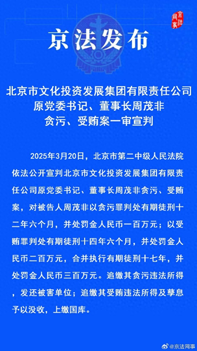 新京报讯 据京法网事消息,2025年3月20日,北京市第二中级人民法院 依法公开宣判北京市文化投资发展集团有限责任公司原党委书记、董事长周茂非贪污、受贿案,对被告人周茂非以贪污罪判处有期徒刑十二年六个月,并处罚金人民币一百万元;以受贿罪判处有期徒刑十四年六个月,并处罚金人民币二百万元,合并执行有期徒刑十七年,并处罚金人民币三百万元。追缴其贪污违法所得,发还被害单位;追缴其受贿违法所得及孳息予以没收,上缴国库。