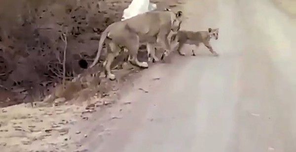 最后母狮与自己的幼崽慢悠悠地走出森林,走到马路上去了。(实习编译:盛肖倩 审稿:朱盈库)