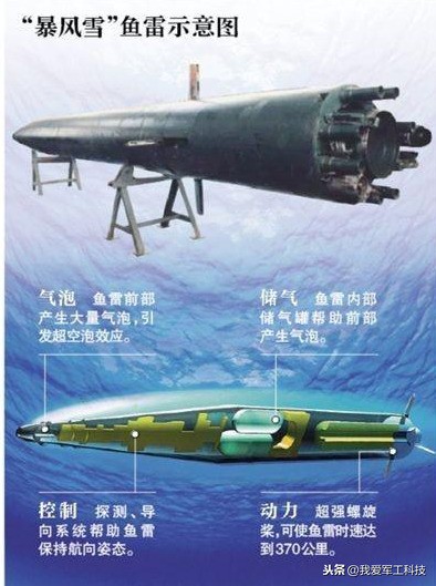 在“暴风”鱼雷头部装有空泡发生器,它呈圆形或者椭圆形平盘状,向前倾斜形成一个“冲角”,以产生 “暴风”超空泡鱼雷结构 [1] 支持雷体前部的升力。紧靠空泡发生器后面是几个环状通气管,它将火箭排气注入空穴气泡以使其涨大。鱼雷从潜艇上的发射管发射后,先由8支启动火箭工作,将鱼雷加速至超空泡速度。航行时首先由空泡发生器产生局部气泡,然后由通气管向局部气泡注入气体,使之膨胀成为超空泡。然后主火箭发动机工作,使鱼雷在水中高速运行。“ 暴风”鱼雷在水中运动时,空气从头部排出,在雷体表面为气泡所覆盖,形成“超空泡”。所以,它的水阻力很小,速度很高,大大超过普通鱼雷。在鱼雷尾部拖有制导导线,用来控制鱼雷的运动和引爆战斗部。