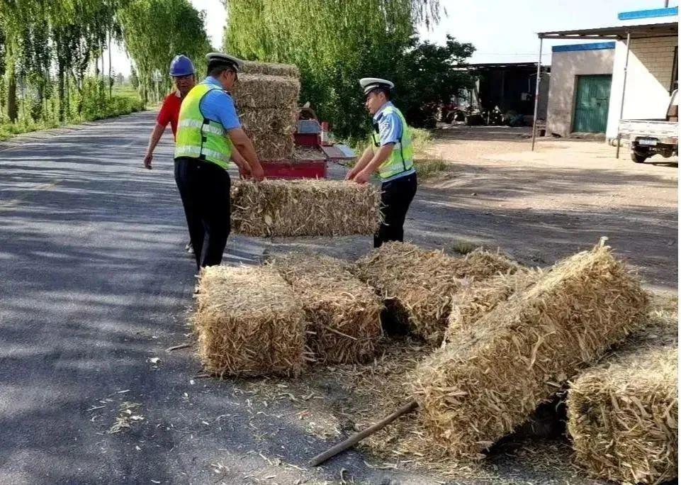6月12日上午9时许,高台县公安局交警大队宣化中队在S301线宣化镇台子寺村路段巡逻时,发现一辆电动三轮车停在路边,路面散落着一大推草料墩子,一位老人正吃力地往路边挪动掉落的草料墩子。民警询问了解到,老人是附近村民,在拉运草料过程中,因电动三轮车违规装载,在拐弯时车轮驶入路肩小坑,导致近十个草料墩子掉落在路面。由于草料墩子太重,一个人无法装车,为不影响其他车辆通行,老人只好先将掉落在路面的草墩子挪到路边,然后再联系家人前来装车。