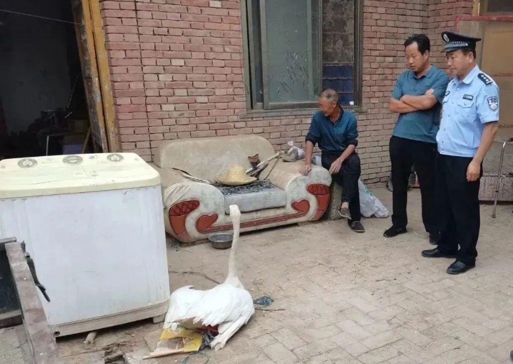 6月22日20时许,高台县公安局巷道派出所接到巷道镇东湾村党支部书记电话报警称,本村一村民在放羊回家途中发现一只受伤的大鸟,因该鸟翅膀及脚部轻微受伤无法正常飞行,遂带回家中。接警后,民警立即赶往村民家中,通过仔细观察,初步确认该鸟为野生保护动物天鹅,随即和镇干部将大鸟送往县野生动植物保护管理站,经县野生动植物保护管理站工作人员鉴定,该鸟为国家二级重点保护动物大天鹅。