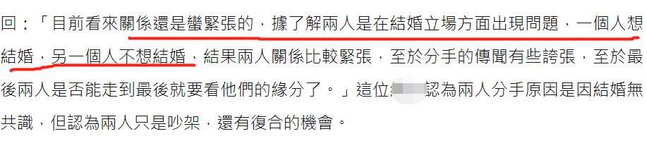 媒体所说的是两个人在结婚这方面有一些立场不同,一个想结婚,一个不想结婚,所以说两个人的关系并没有大家想象的那么坏,只是关系有些紧张,这就像是小两口吵架,只不过粉丝媒体唯恐天下不乱,把事件扩大化了。至于两个人到底能不能走到最后就看两个人怎么处理结婚这件事了。
