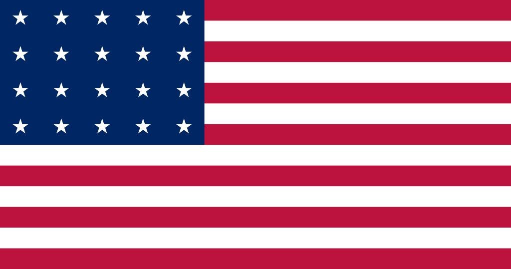 15横条15星星版本的美国国旗一共用了23年,到后来印第安那州、路易斯安那州、密西西比州、俄亥俄州、田纳西州也纷纷加入美利坚和众国,美国有20个州了,国旗怎么变?该不会是星星和横条都是15吧?那横条就变成细横纹了,想想都知道再往下发展横条肯定很难加了啊,所以这个时候正式定为左上角的星星代表州数,右边的横条代表了最初的13个州。