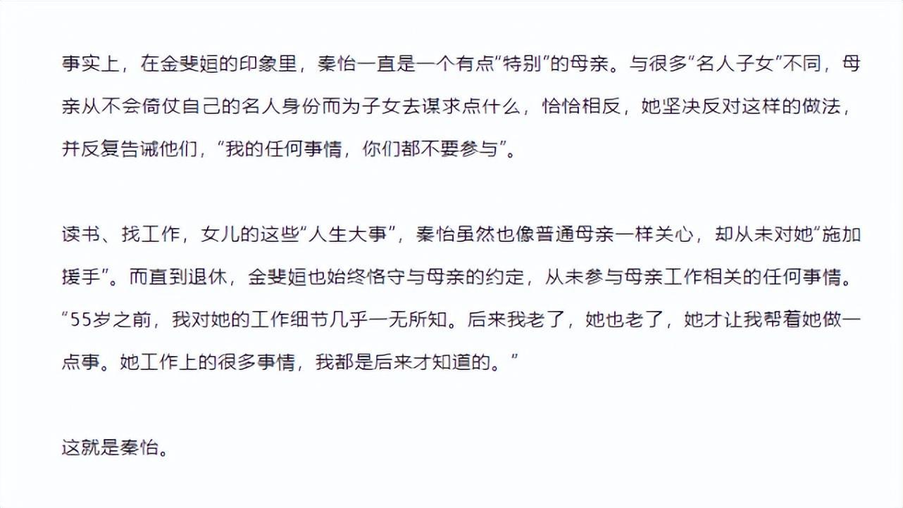 虽然金斐姮是秦怡老师唯一的亲人,但网络上关于她们母女俩的报道却是各种不合,称母女俩很少走动,直至晚年。