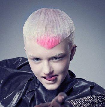 美人尖的女人更加优雅,美人尖的男生更有男人味,这款有着倒三角设计的桃心刘海在额前采用粉红色的挑染,被修剪出独特造型的超短发采用粉白色的渲染,精致的蛇精脸愈发炫酷狂野。