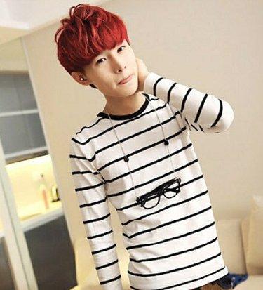 再来看一款短发西瓜头发型,这款将发顶外层的发丝做飘逸动感的纹理烫发,对于个子较低的男生可以起到很好的增高作用,火红色的渲染很有喜感,同时也很好的展现男生活波开朗的个性。