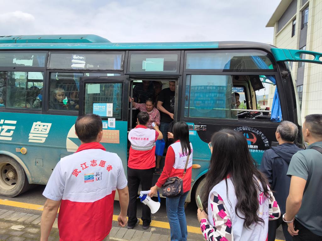 上午 9 时,参加紧急转运的粤运快车陆续到达江湾镇围坪村党群服务中心广场,韶关粤运志愿者配合镇村干部,有序组织村民分批登车撤离。