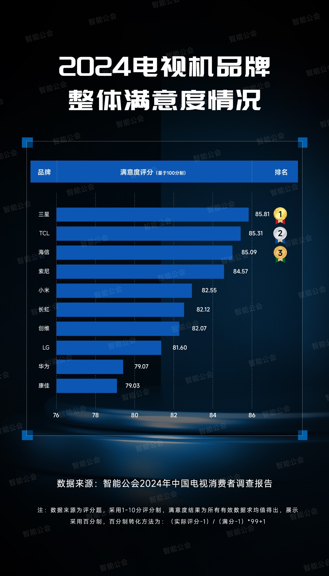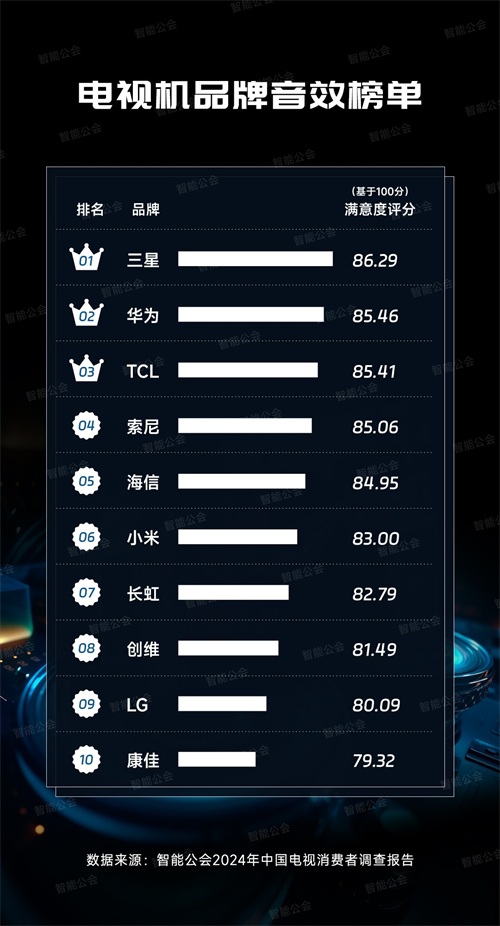 那么,哪个电视品牌最受消费者欢迎呢?近日,国内调研机构智能公会针对这一问题,做了个2024年中国电视消费者调查报告,并且针对用户满意度对2024年电视机品牌排行榜前十名进行了最新统计,其中三星电视、TCL电视、海信电视、索尼电视、小米电视、长虹电视、创维电视、LG电视、华为电视和康佳电视名列前十,是目前口碑最好的电视机品牌。