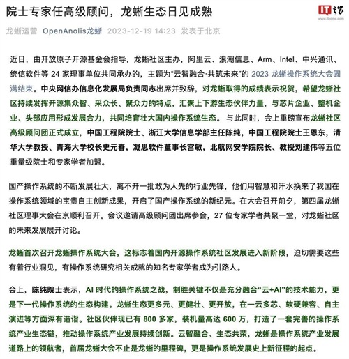 12 月 21 日,2023 龙蜥操作系统大会上,官方宣布 Anolis OS“龙蜥操作系统”免费发行版下载次数已超过 250 万次,总装机量已超过 600 万,社区伙伴已有 800 多家,如今生态“日见成熟”。