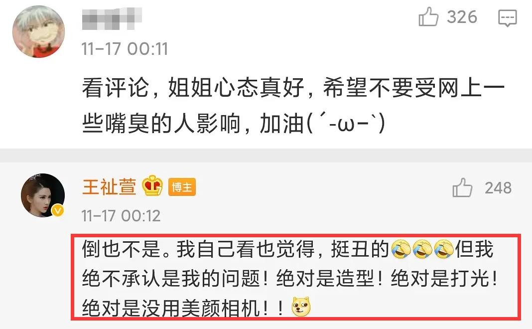 不过在方怡上线后,却有很多观众吐槽王祉萱饰演的方怡太老气,王祉萱也脾气很好的一一进行了回复,还称她看了之后也觉得挺丑的,还开玩笑说绝对是造型的问题。