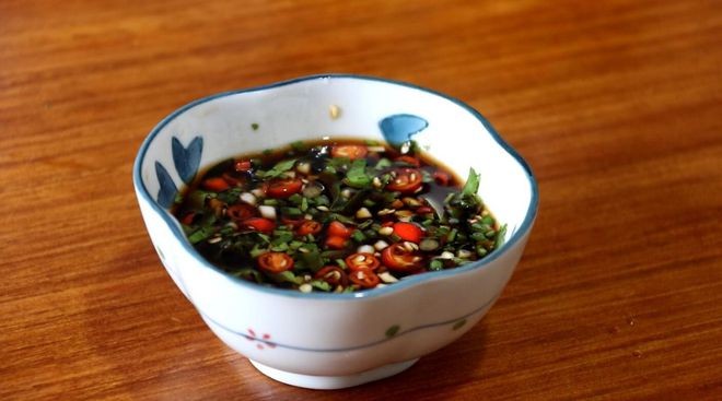 6、 准备一个酱汁,碗中加入切好的蒜末、香菜末、葱末、小米辣、生抽、白糖、醋和适量的凉白开,调匀。