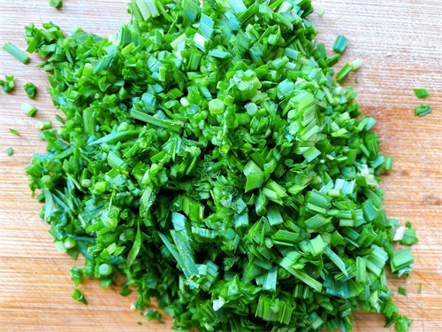 4、韭菜沥干水分之后,切成韭菜末,切得稍微细一点,切碎备用;