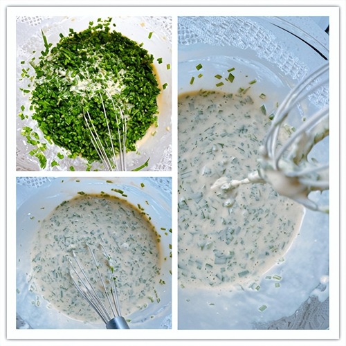 5、切碎的韭菜末加入到面糊中,搅拌均匀,现在的质地和酸奶是差不多的,搅拌均匀之后开始煎;