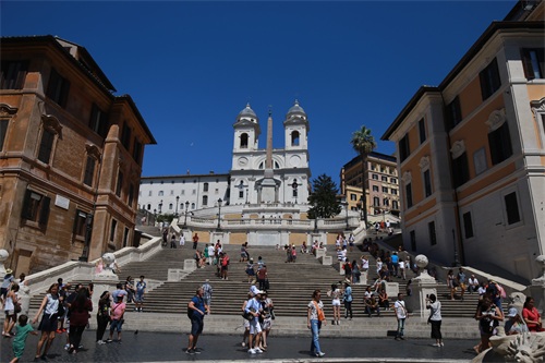 有三处跳舞场的西班牙台阶上建有古代埃及的方尖塔,方尖塔的后面是山上圣三一教堂,俯瞰整个广场。被称为“意大利人设计、法国人出资、英国人游览、如今被美国人占领”的西班牙台阶,实际上是1725年得到法国大使的援助后修建的,又因为西班牙使馆在这里,所以取名西班牙台阶。