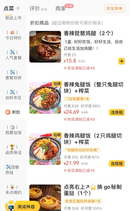 观观立马大气地点了几份明星产品:香辣鸡腿饭、卤肉饭、泰式酸辣饭还有二两一份的香辣机翼兔腿!