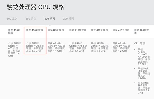 面向中低端市场的400系就不如它的两位老大哥,其参数规格着实“不堪入目”、能耗表现差强人意,因此少有被手机品牌采用。更为重要的是,在“一分一厘”都显得尤为重要的低端手机市场,骁龙400系在性价比方面显然不比联发科处理器更具竞争力,因此400系声明不显也不难理解。而更为低端的200系列,编者就在这里不做展开了,因为稍微有点追求的手机品牌都不会使用该系列。