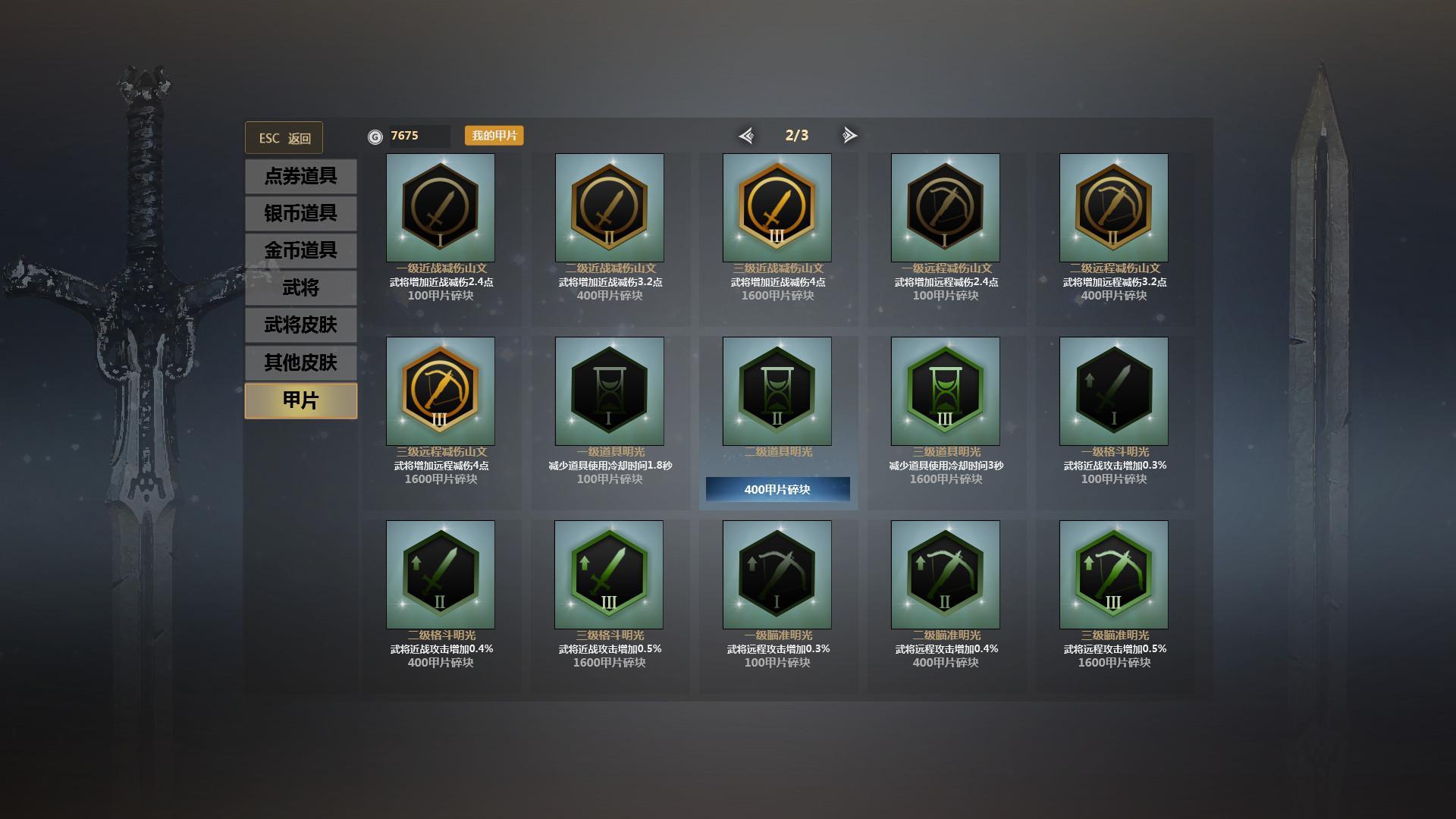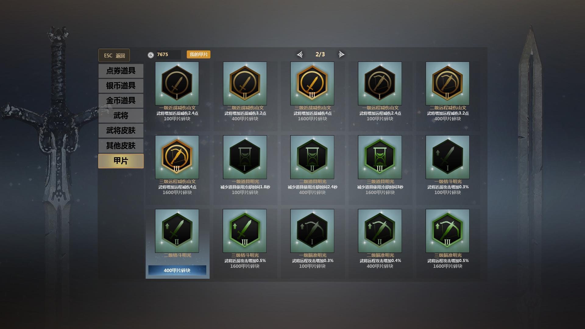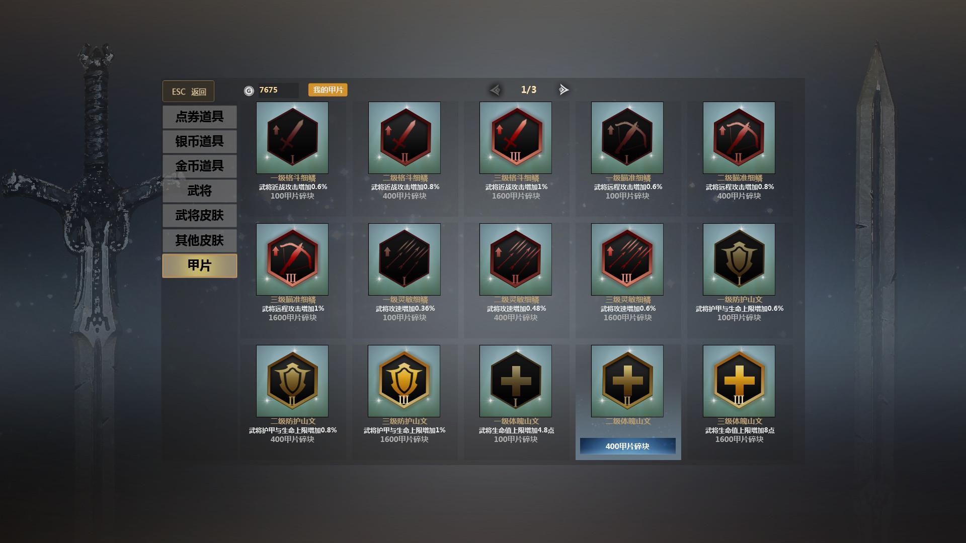 英雄对决没有部队参与,那么这个甲片系统就很关键,甲片有攻击加成、攻速加成、HP加成、减伤、道具冷却、针对不同的英雄就该搭配合理的甲片。如伊贺战忍的服部半藏、十字军对攻速的需求、关羽、杰拉德等骑兵则对攻击力的需求、凌统、貂蝉对减伤等等。