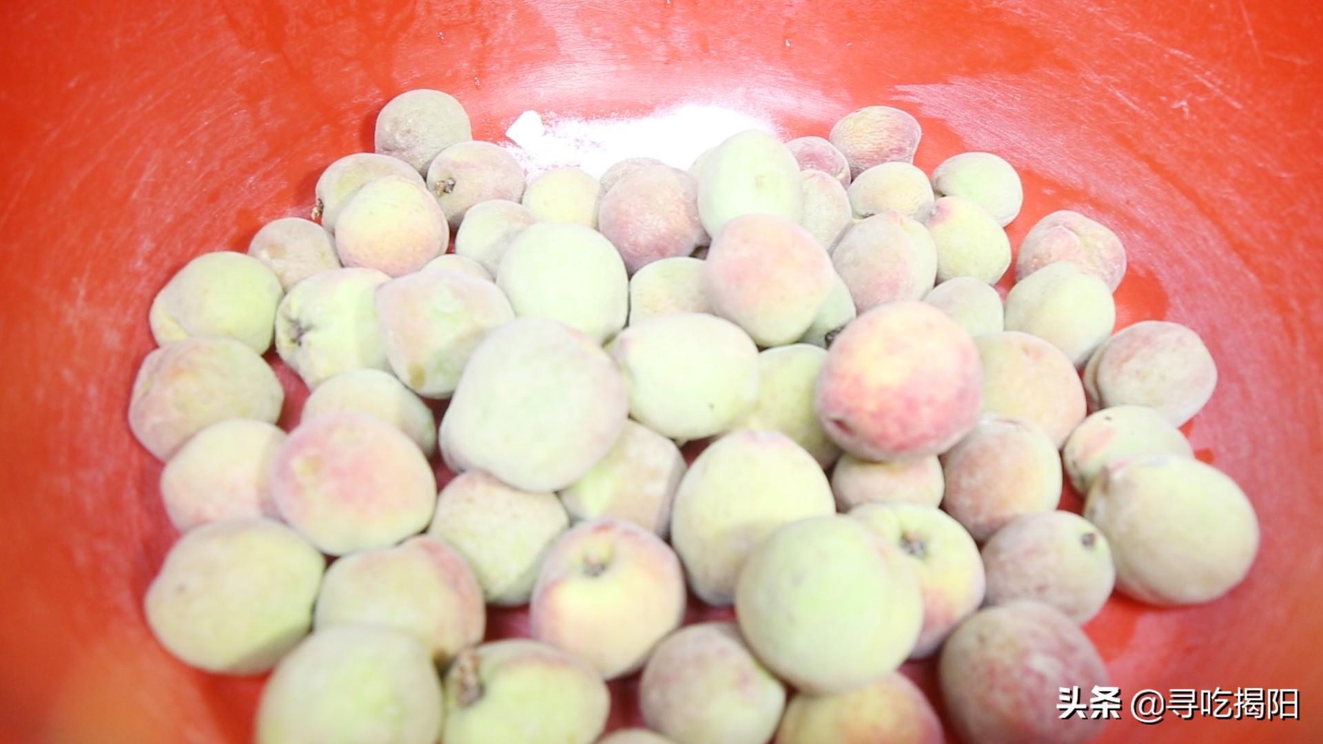 “脱完毛”的桃子要用清水清洗干净,再倒入梅汁,重复拖桃的动作,直到梅汁充分渗透到每颗桃子,带给桃子酸甜酥脆的口感,听阿叔说,不加香精等其他杂七杂八的东西,自然拖出来的桃果香味十足,会随着时间的变化稍微变色,但是存放在冰箱,第二天的口感还是一样酥脆,不会变软。