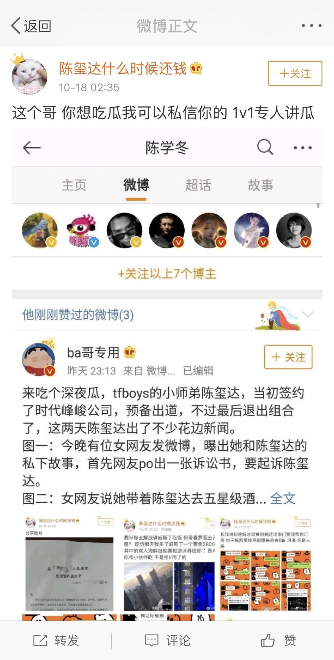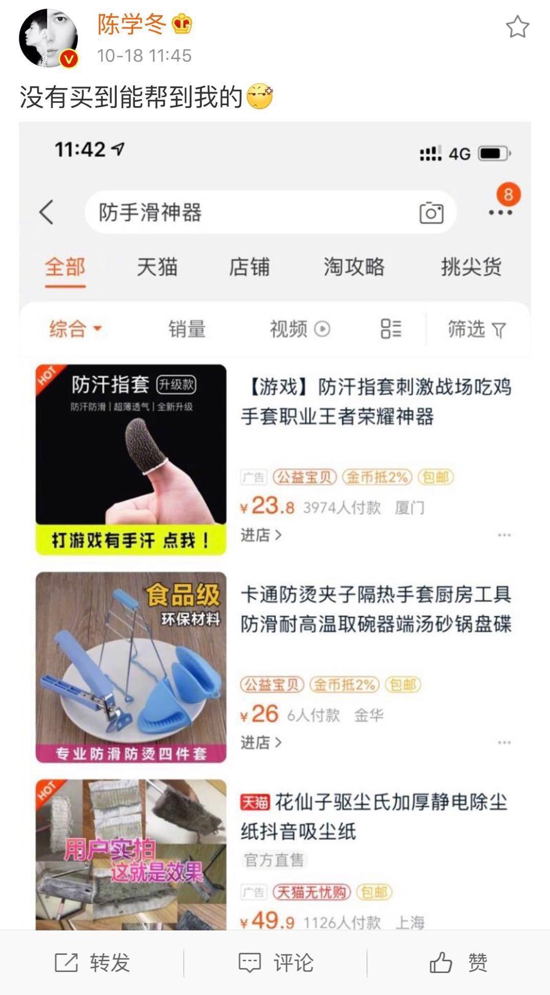Yes娱乐10月18日综合报导昨晚,陈学冬微博帐号手滑点赞了营销号八卦粉丝控诉某未成年艺人不良行为的微博,四十几分钟后取消点赞。虽说事情发生在深夜,但众多“熬鹰”网友还是发现了端倪,原来这位名叫陈玺达的练习生和陈学冬名字缩写都是cxd,早前就有很多粉丝在微博上带cxd缩写要求其还钱,冬冬应该是半夜搜自己时一不小心吃了个瓜,一不小心又手滑点了下赞。今早,陈学冬微博幽默回应手滑点赞,晒出一张电商截图,配文称“有没有能帮到我的?”场面一度十分搞笑。网友纷纷回应“他只是吃个瓜,大家放过他吧哈哈哈哈哈”“搜自己名字缩写也太可爱了吧”“陈学冬一定在内心os:我寻思怎麽都让cxd还钱?”。