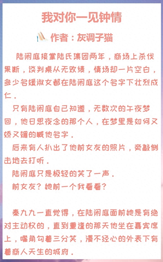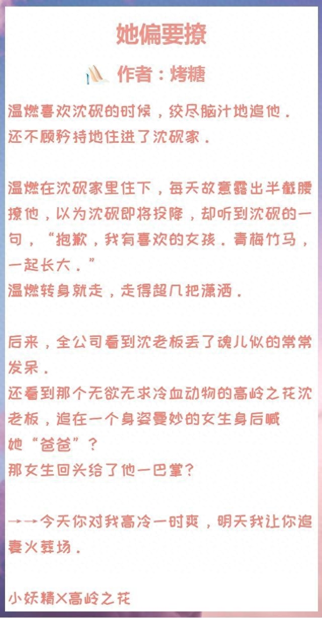 短评:豪门、一见钟情、白月光、追妻火葬场,差不多这四个词可以概括出本文精髓。开场女主就对男主钟情,前期可以说想方设法在撩,然而心有白月光男主油盐不进,还作死放了狠话,由此开始了后期惨痛追妻路。文中女主性格非常讨喜,敢爱敢放手,不拖曳,豪门线斗偏心父亲和白莲花继姐,感情线洒脱走不痴缠,可以说既不圣母也不恋爱脑。这样的性格造成男主这边刚想开启甜宠模式,女主这边就已经人没了,日常冷脸、各种嫌弃不要太多,也是叫男主好好理解了一下什么叫“祸从口出”。总结一下,本文套路非常经典,作者文笔也比较成熟,各种角色设定、喜闻乐见的剧情手到擒来,情节跌宕起伏,值得强推。