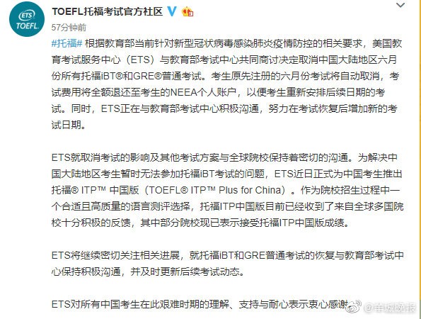 【6月份6项海外考试取消,考生该何去何从?】今日,教育部考试中心发布通知:根据当前新型冠状病毒防控的相关要求,继续取消6月托福、雅思、GRE、GMAT等考试。连续数月的考试取消无疑是对广大准留学生院校申请进程的巨大挑战。与此同时,@ TOEFL托福考试官方社区 宣布正式推出“托福ITP中国版”,帮助中国考生在这个特殊时期展现自身学术英语水平并完成院校申请。目前,英国伦敦大学学院(UCL)、美国哥伦比亚大学、卡内基梅隆大学、杜克大学法学院,德国科隆大学,荷兰鹿特丹管理学院等全球多所院校认可。考场已覆盖包括广州、深圳、北京、上海、天津在内的多个国内主要城市,考试日期也已开放至7月25日。托福ITP开考