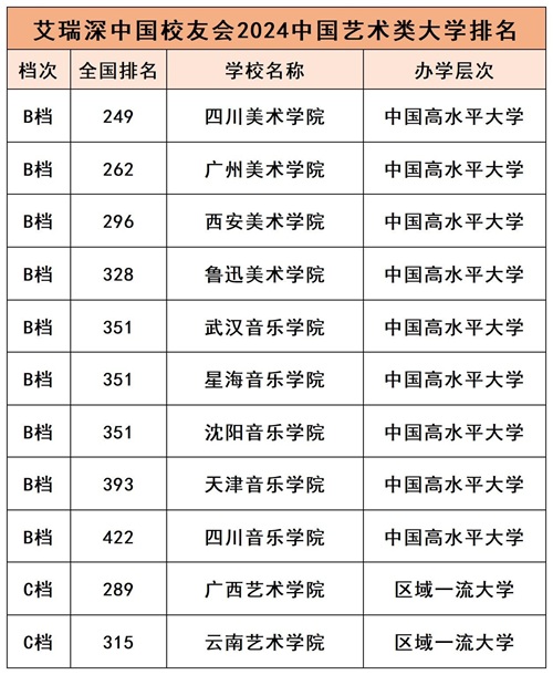广东省内的2所艺术类大学均入选中国高水平大学行列,其中广州美术学院在全国排名262,星海音乐学院在全国排名351。