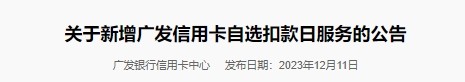 2023年12月11日广发银行发布《关于新增广发信用卡自选扣款日服务的公告》,宣布于2023年12月14日起,新增广发信用卡自选扣款日服务,可以在账单日后至最后还款日前两天期间任选一天作为自选扣款日,在自选扣款日当天根据按指定的还款方式(最低还款/全额还款)向关联的广发借记卡进行扣款。