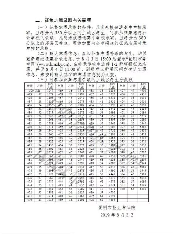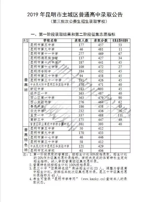 昆明市第三批次学校录取分数出炉