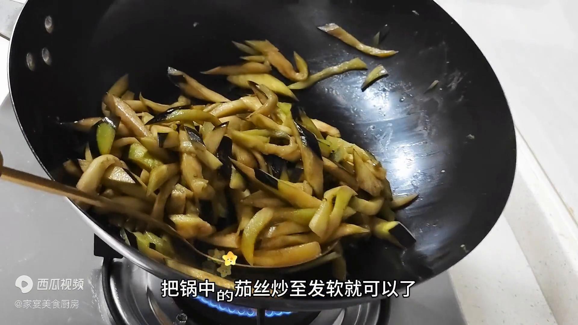 5. 倒入半小碗清水,把锅中的茄丝炒至发软就可以了。