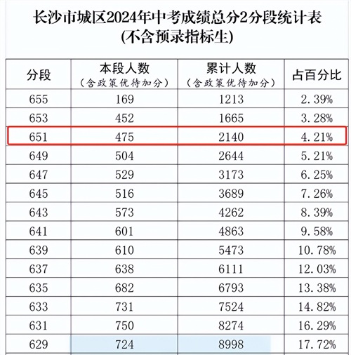 2024年长沙市中考,四大名校录取线约为651分(全市前4.21%)