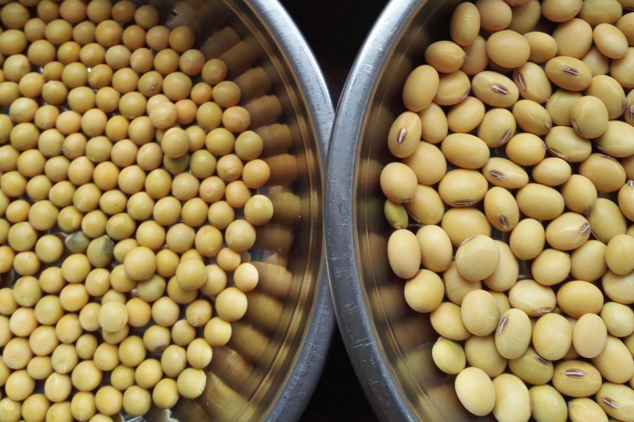 2、准备100克黄豆,装进盆中,加入清水浸泡15个小时,中途更更换一次清水,盆子要大点,因为黄豆会越泡越大。