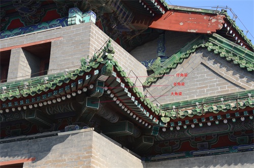 传统古建筑的角梁只有老角梁和仔角梁组成,唯独城楼又多了一个大角梁。