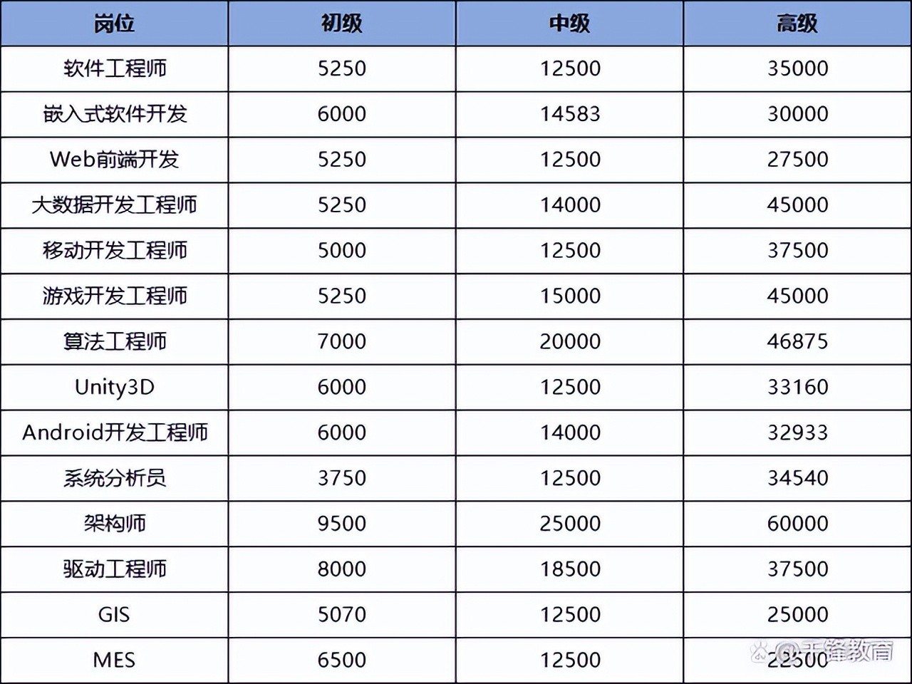 以下图中列举了软件工程师、嵌入式软件开发、Web前端开发、大数据开发工程师、移动开发工程师、游戏开发工程师等各个岗位的初级、中级、高级月薪数据,其中薪资最高的职位是架构师,最低工资是8000元,最高工资60000元,具体数据如下图:
