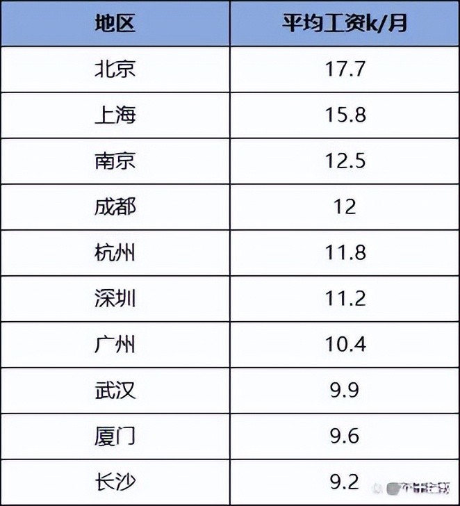 以下图中列举了北京、上海、南京、成都、杭州、深圳、广州、武汉、厦门、长沙等地区的IT小程序员月薪情况,月薪排前三的城市分别是北京、上海、南京,依次是17.7K、15.8K、12.5K,具体数据如下图: