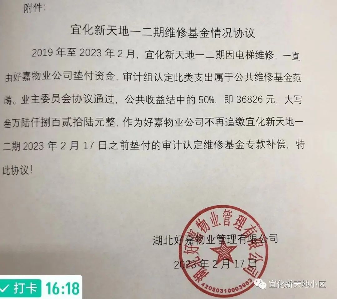 经过审计,认定公共收益结余73652元。鉴于2018年11月至今,彩生活物业公司承接宜化新天地物业之后,在电梯维修等范围内,理因使用维修基金范畴里垫付了318760元,而未动用公共维修基金,有利于小区的长久居住保障。经业委会协议,公共收益结余部分的50%,即36826元,作为物业垫付维修基金支出补偿,好嘉物业公司不再追缴2023年2月及之前所垫付的维修基金。
