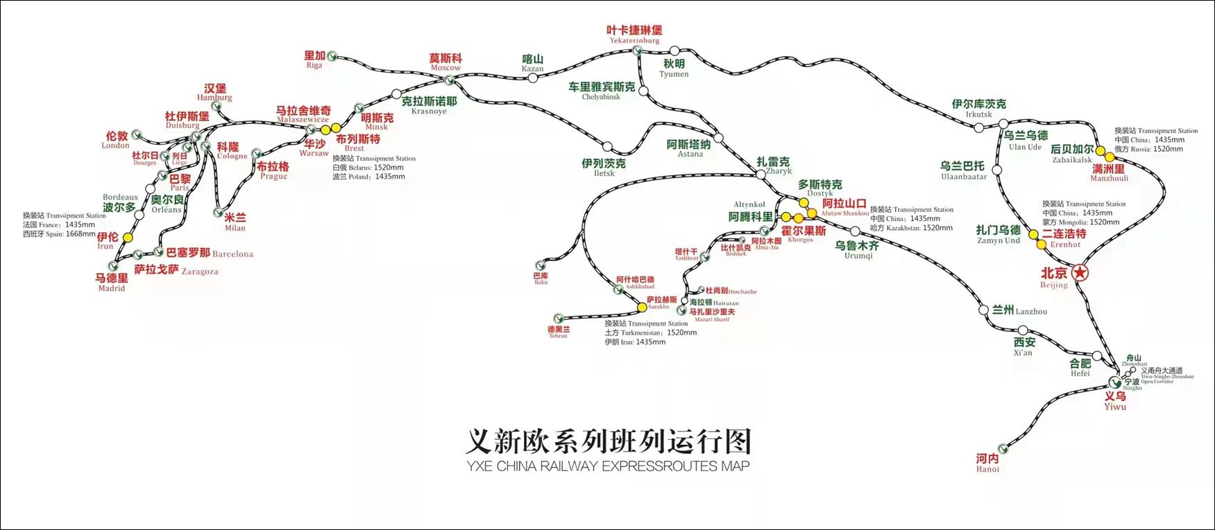 重庆-西安-兰州(甘肃)-威武(甘肃)-哈密(新疆)-乌鲁木齐(新疆)-石河子(新疆)-奎屯-(新疆)阿拉山口(新疆)(出境口岸3945km)-换轨(国际标准轨1435mm换成宽轨1524mm主要是哈萨克斯坦,俄罗斯,白俄罗斯)-多斯特克(哈萨克斯坦)-途径俄罗斯-大约5600km到达-布列斯特(白俄罗斯)-换轨(宽轨1524mm换成国际标准轨1435mm)-马拉舍维奇(波兰)-华沙(波兰)-柏林(德国)-杜伊斯堡(德国终点站)全程大约11000km,耗时大约15-17天;