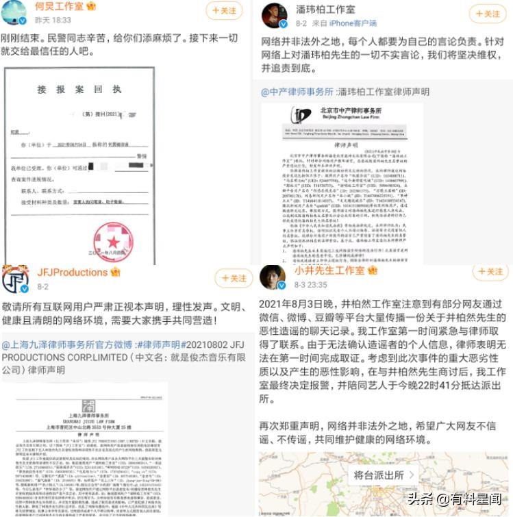 后有林俊杰、潘玮柏、范冰冰、井柏然、包贝尔、何炅被曝吸毒、涉及某产业链,纷纷发律师函或是直接报警以证清白。