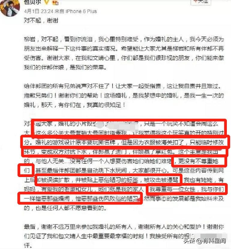 本以为包贝尔等人会向柳岩道歉,但没想到首先等来的却是柳岩这位受害者的道歉视频,在视频中,柳岩为弄砸了好友婚礼表示了歉意。