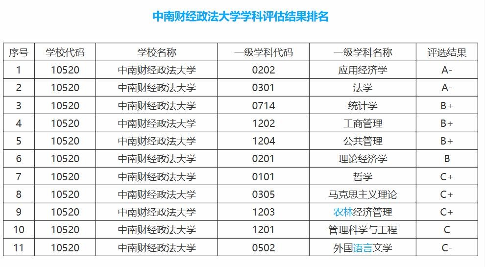 在第四轮学科评估中,中南财经政法大学的应用经济学、法学2个一级学科评估为A-,作为一所非985大学,可以说是很高的水平了。也有统计学、工商管理等经管学科评估为B层次,不算太差。