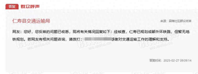 官方最新回应很实在:"仁寿已规划成都外环铁路,但暂无地铁规划。"