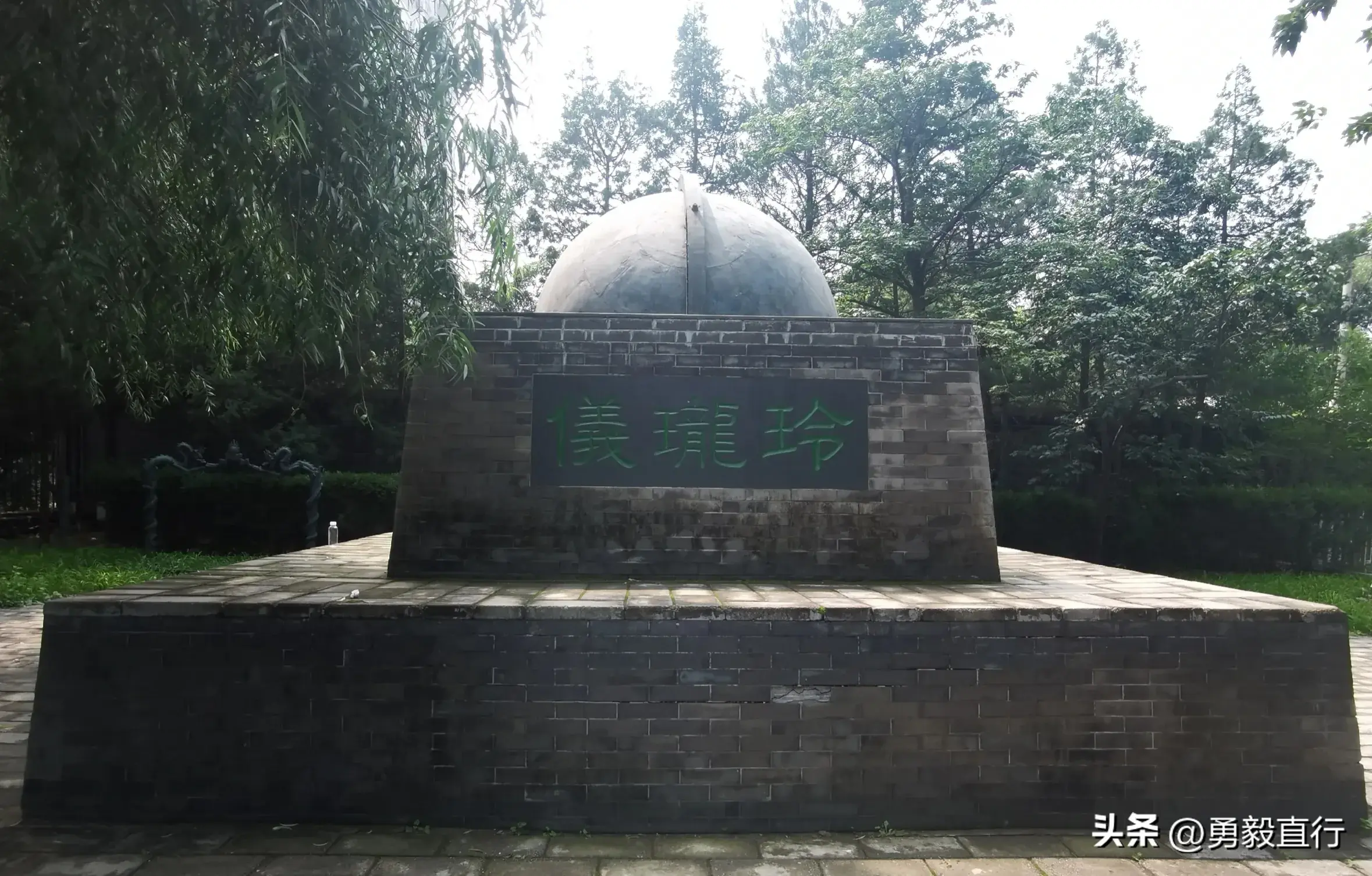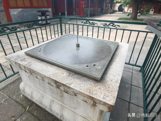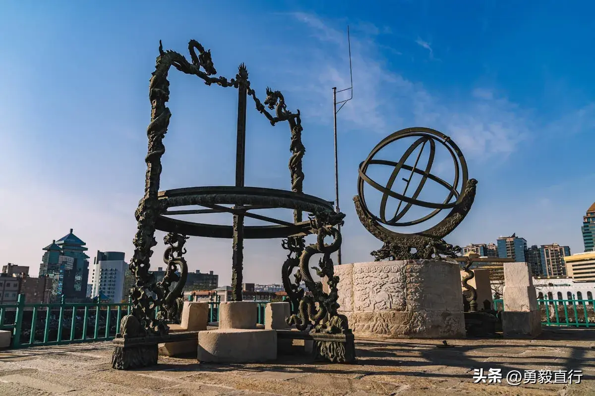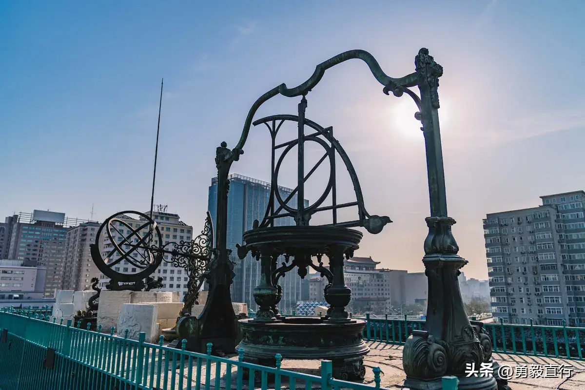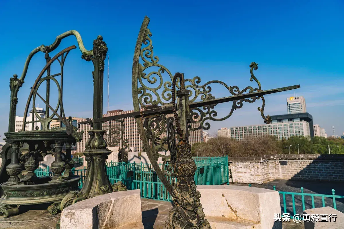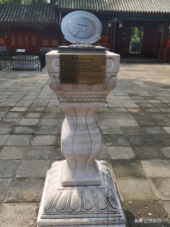 后院的区域并不大,有明代浑仪和简仪的复制品,真品在九一八事变后,1933年迁至南京紫金山天文台。还有玲珑仪的复制品,角落未开放的临战景堂旁边,还有日晷和圭表等古代计时仪器展示,都是石制的。有地平式日晷,相当于现在的钟表,不过针影在石盘上指出的时间不是现在咱们用的北京时间,而需要在现在的时间上加上15分钟。