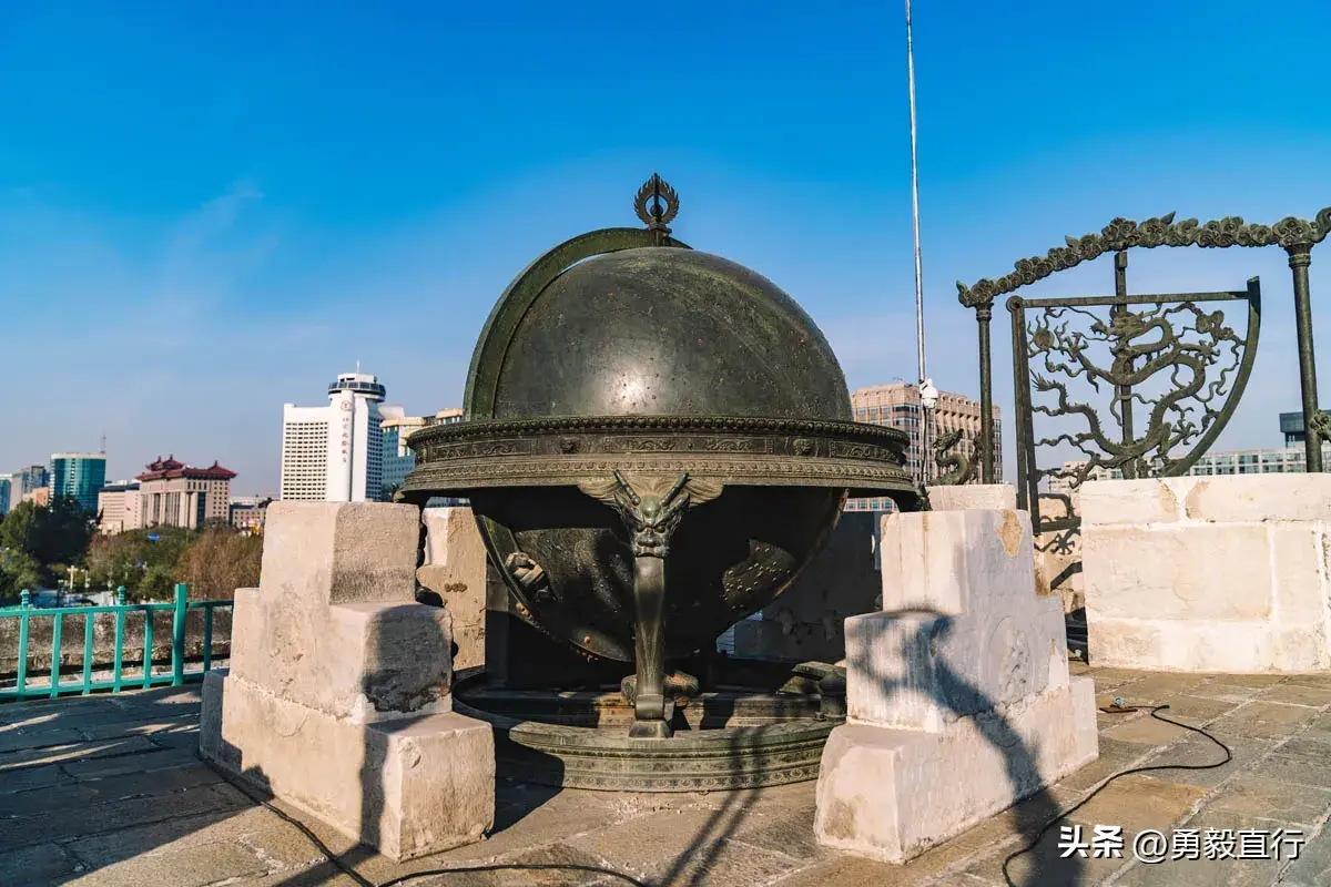 接着就是登上古观象台,通高14米,相当于现今的四层楼房。两段台阶就是一个100多平方米的平台,平台的一边是一座小房,据说是当年观象台上值更衙役的宿舍,另一边则陈列着观象台的所有家当——8架观测仪器。这8架仪器,都是清朝所造。