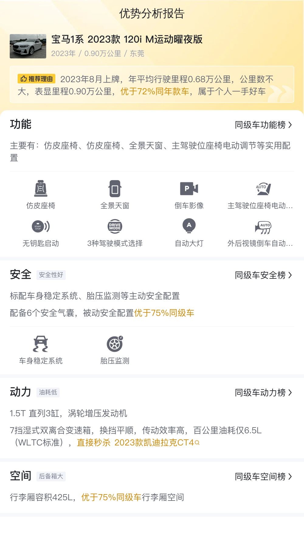 以上,就是我们对这辆二手宝马2023款1系120i M运动曜夜版的全部介绍了,您觉得怎么样?最后,提醒您一下,二手车一车一况,一况一价,对于一辆二手车价格是否合适,一定要综合这辆车的车况等综合信息考量,祝您购车愉快!