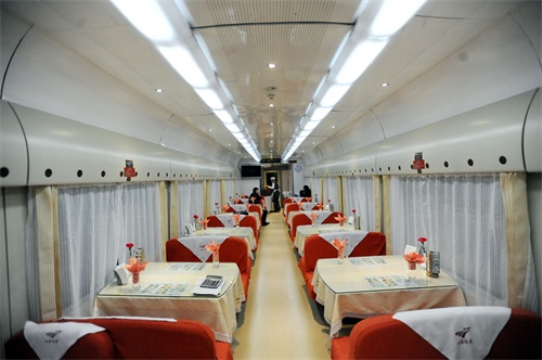 与以往见到的车体不同,这趟车无论是在餐车、卧铺,还是硬座车厢都设置有供氧设施。记者了解到,此次列车采用青藏高原版25T型客车。这款客车专门为青藏铁路运营,是针对青藏高原的特殊环境及气候条件而特别设计生产的高原铁路客车。