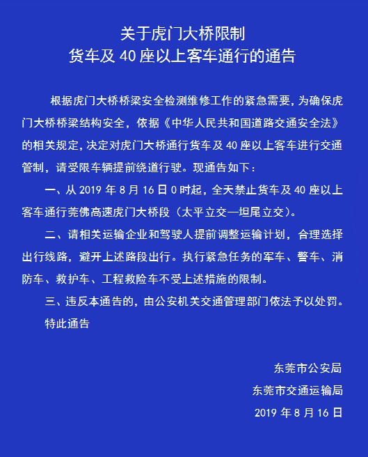 因虎门大桥桥梁安全检测维修工作的紧急需要,为确保大桥桥梁结构安全,依据《中华人民共和国道路交通安全法》的相关规定,决定在桥梁维修期间,对虎门大桥货车及40座以上客车进行交通管制。